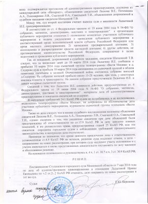 Судья Бондарев взял отвод, его сменил судья Евгений Есин, который тоже не стал вызывать никого из представителей полиции или местной администрации. Он спросил Ладыгину, ходила ли она с журналистами по деревне. «Потом я поняла, — замечает активистка, — если бы выяснилось, что я ходила со съемочной группой, он бы мне шествие припаял». Судью также заинтересовало, что на встречу кто-то принес плакат. На это Ладыгина ответила, что не имеет к этому отношения, сама плакат не приносила и не держала, да и ни в каком законе не сказано, что на встречу с прессой нельзя взять плакат. В итоге Есин уже без предложений сделки переквалифицировал обвинение с части 2 статьи 20.2 на часть 5, то есть признал Ладыгину не организатором, а участником, а само мероприятие посчитал не митингом, а пикетом — и 14 ноября приговорил активистку к штрафу в 10 тысяч.