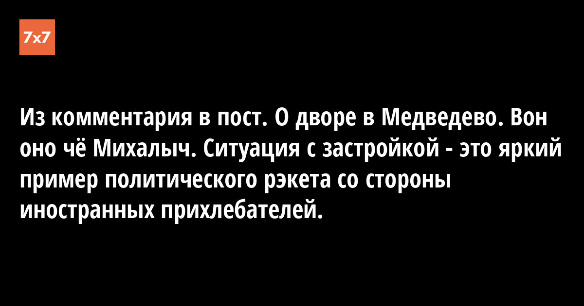 Из комментария в пост. О дворе в Медведево. Вон оно чё Михалыч. Ситуация с застройкой - это яркий пример политического рэкета со стороны иностранных прихлебателей.