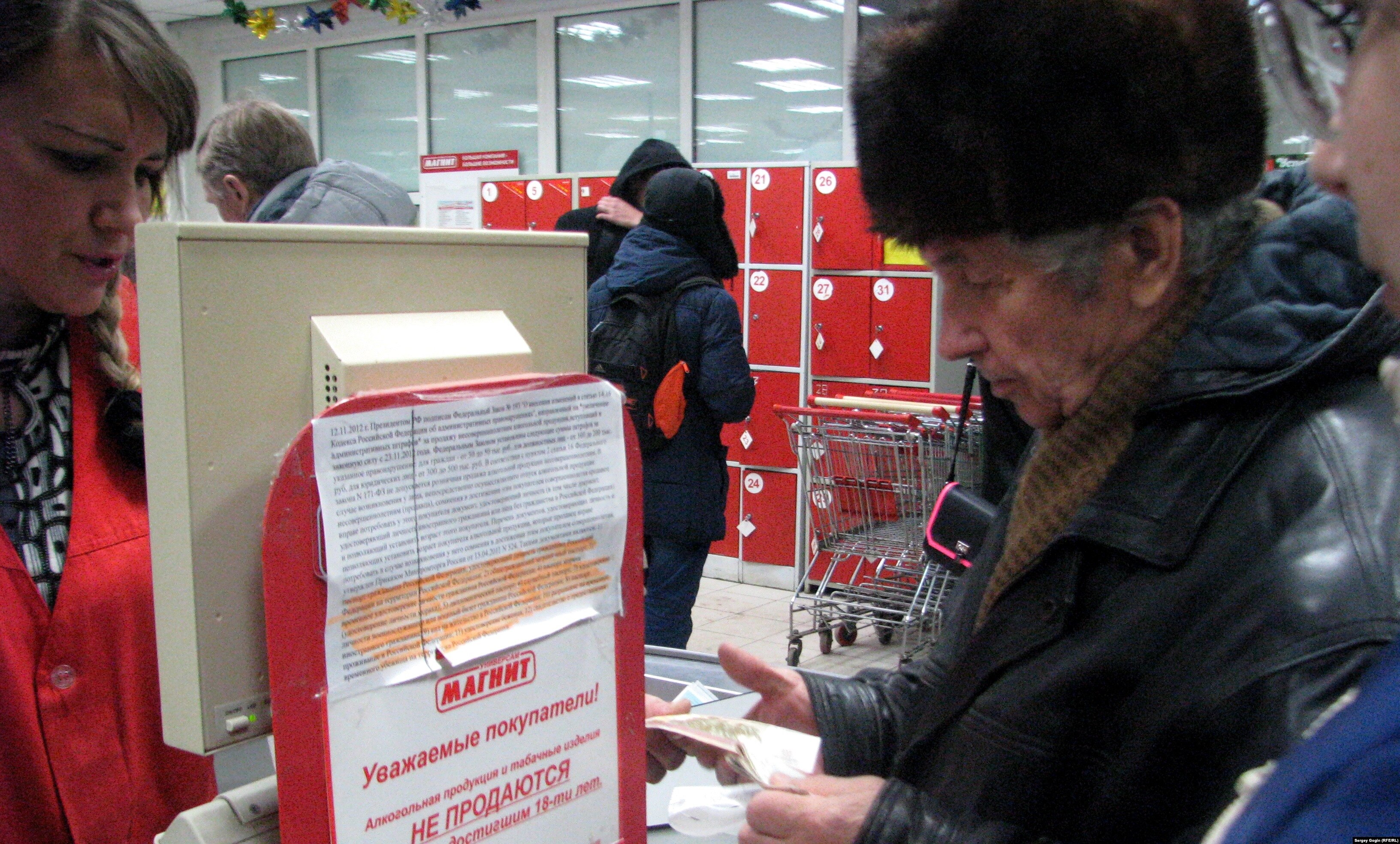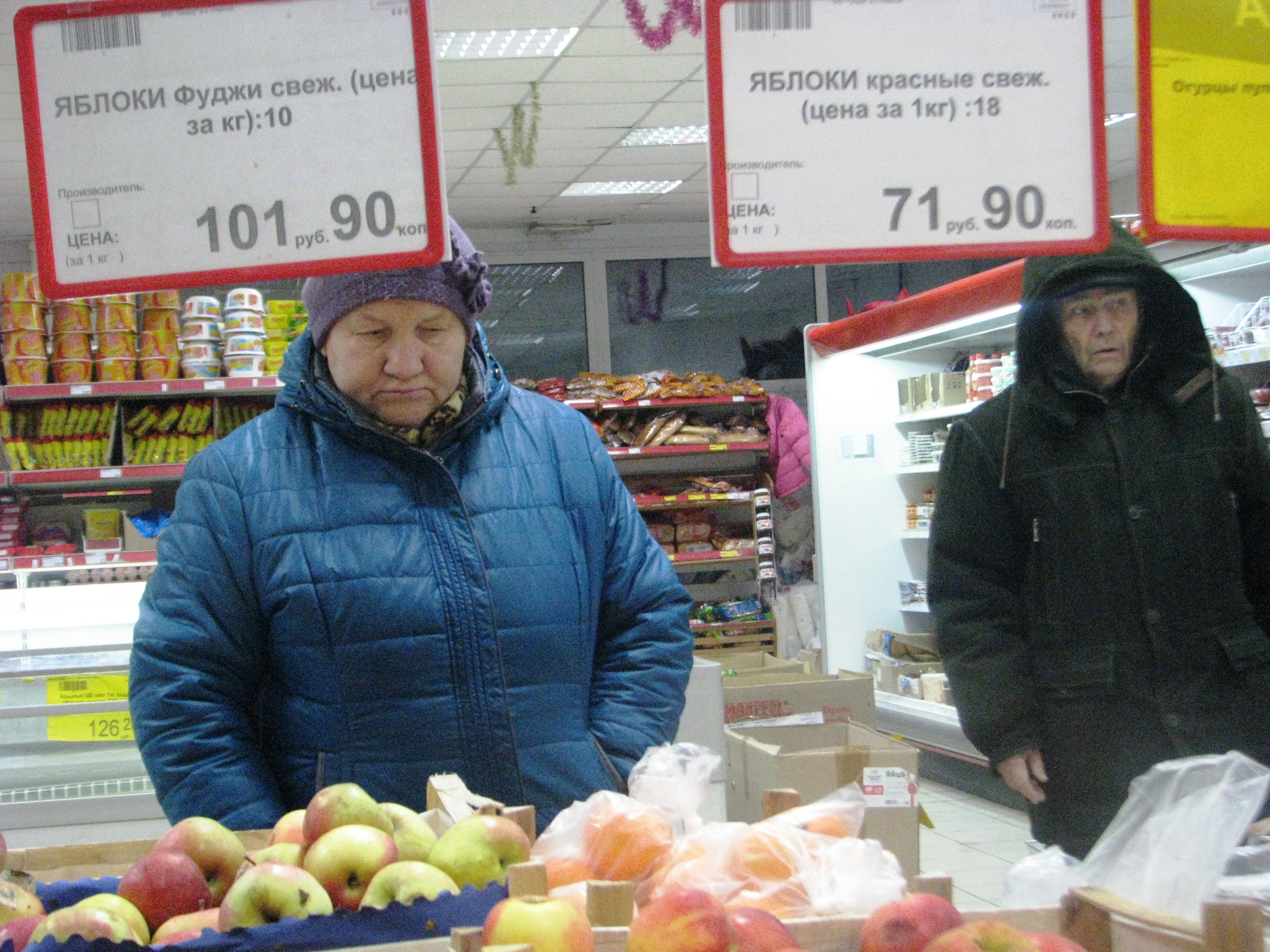 Работающий пенсионер Александр, сотрудник частной компании, вышел из магазина с купленным пылесосом. Он говорит, что все продовольствие подорожало на 15-20 процентов, а доход семьи уменьшается, потому что его фирма перестала выплачивать премии. Его супруга Валентина соглашается, что продукты подорожали, но скупать гречку мешками она не будет: "Есть домашние заготовки со своего участка". Паники у супругов, тем не менее, нет: "А что толку? Бейся головой об стену – что изменится? – говорит Александр. Супруга с ним согласна: "Надо жить спокойно, и все. Пока есть рабочее место, все будет нормально".