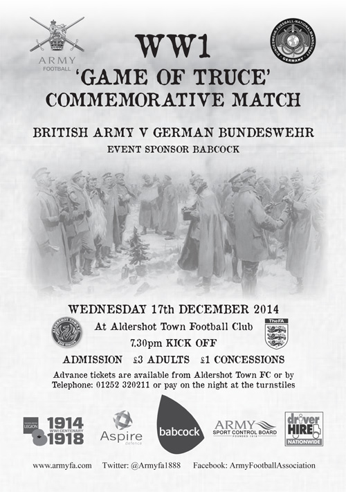 На родине футбола на протяжении ста лет сохраняется память о рождественском перемирии 1914 года, когда британские и немецкие солдаты, побросав оружие, встретились на нейтральной полосе и начали обмениваться подарками, сигаретами, шнапсом, виски, пожимать руки, показывать фотографии жен и детей, поздравлять друг друга с Рождеством. Тут же оказался вброшенный англичанами футбольный мяч. Историки отмечают, что организованного футбольного матча в его современном понимании не было, а была лишь игра без футбольных ворот и фиксированного счета. Тем не менее миф о футбольном матче во время перемирия пережил столетие, и матч в Олдершоте стал тому доказательством.