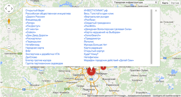 Наряду с региональными проектами на карте расположены также федеральные. Они доступны общим списком. Наполнение и актуализация карты осуществляется как администратором сервиса, так и всеми желающими с помощью технологии краудсорсинга.