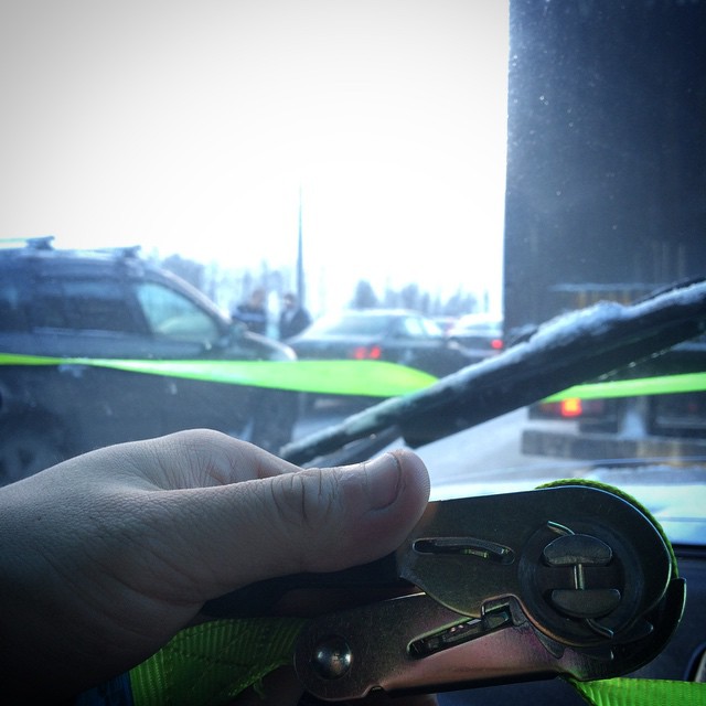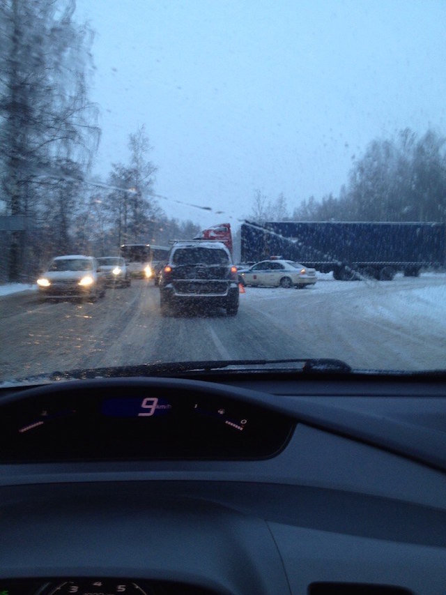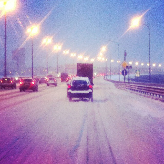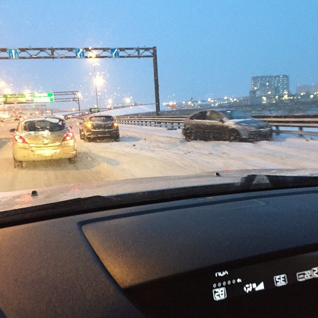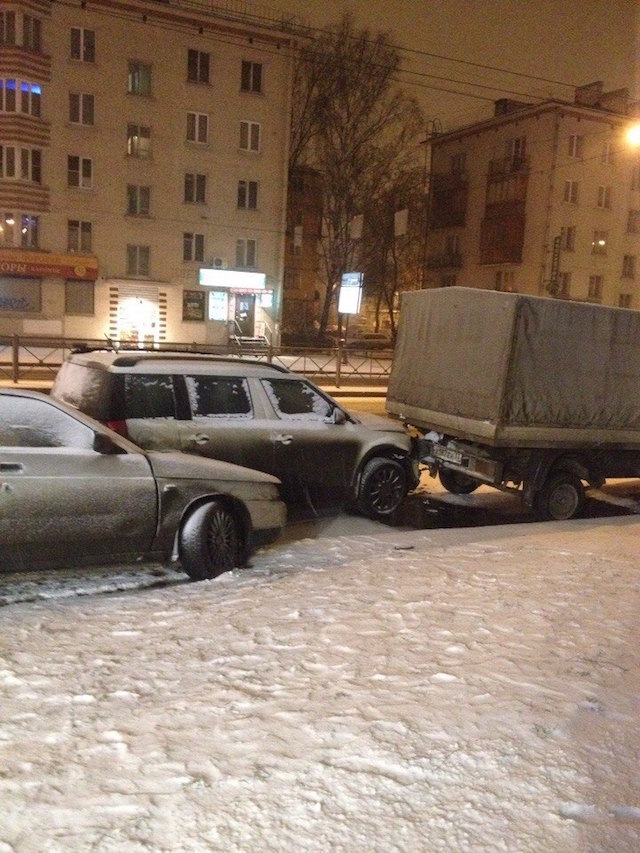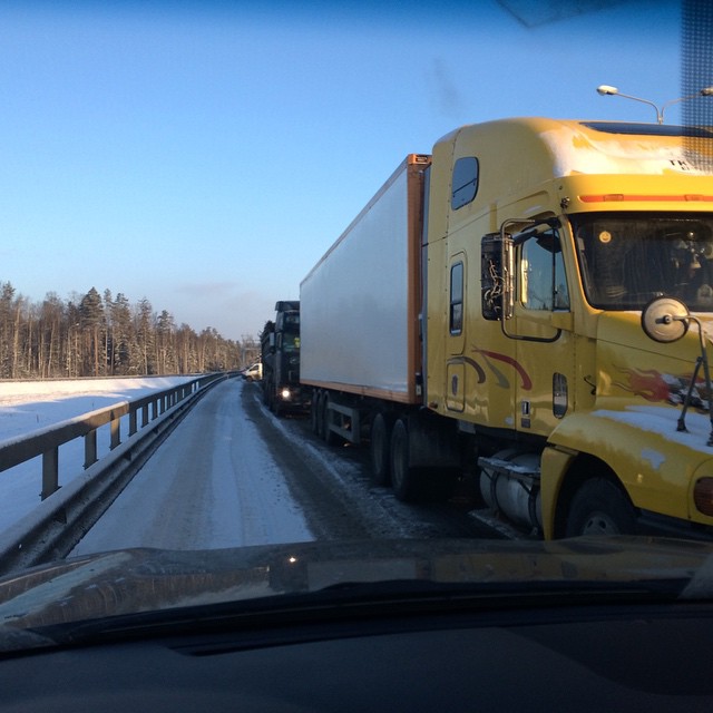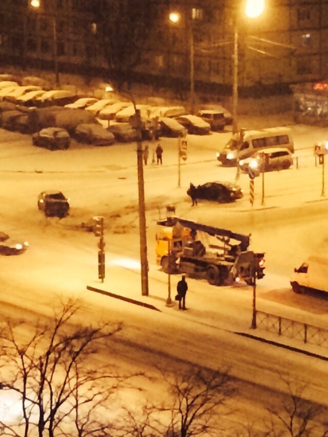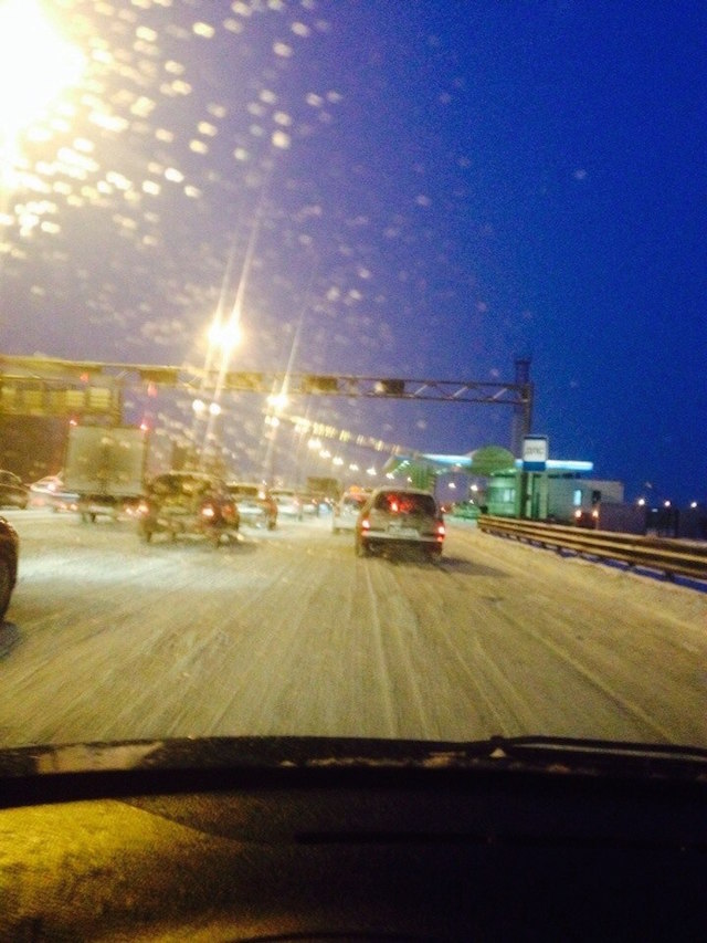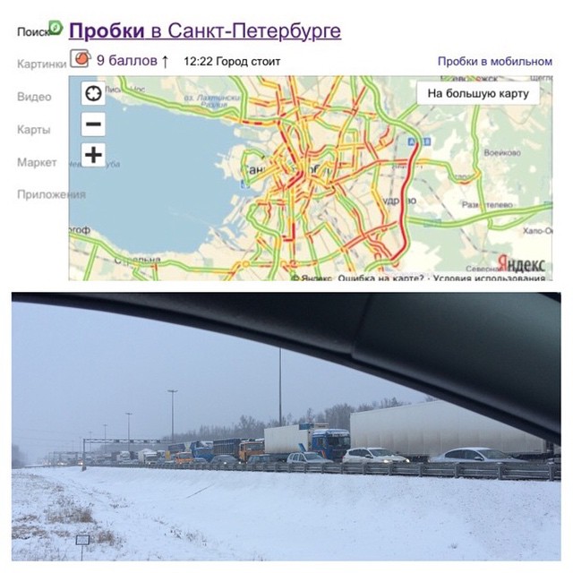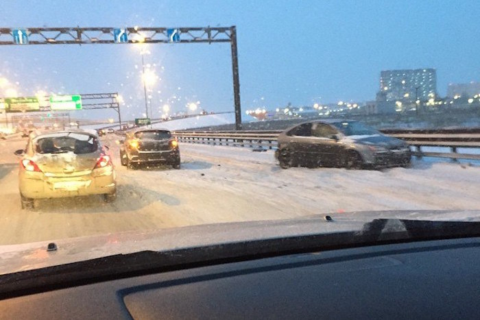 Во дворе улиц Пинегина и Елизарова. Фрагмент фотографии Артура Михайлова 16:35 Соль на подъезде к Вантовому мосту пришлось рассыпать вручную. Из-за образовавшейся там пробки служебные машины не могли подъехать, поэтому выполнять работы пришлось 15-и служащим, которые вышли на проезжую часть и обработали дорогу крупной солью, пишет «Московский комсомолец». Несмотря на то, что ночью участок на внутреннем кольце в восточной части КАД чистили, с самого утра на въезде на мост образовалась пробка, которая быстро растянулась на 14 километров. По словам представителей кольцевой, затор образовался из-за скопившихся на подъезде фур на лысой резине. Чтобы стимулировать движение грузовиков, рабочие подкладывали под колеса гофрированные листы железа для лучшего сцепления с дорогой. 17:06 Пробки на КАД. Видео опубликовано @miaymyr Дек 12, 2014 at 5:39 PST