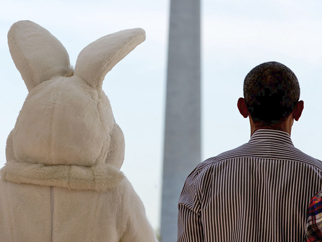 Помимо многочисленных фото с детьми, одна из самых забавных - с человеком в костюме зайца: на пару с президентом Пасхальный кролик, глядя на Монумент Вашингтона, слушает гимн США с балкона Белого дома. Также в подборке можно увидеть, как Обама убивает журналом муху, вторгшуюся в воздушное пространство Овального кабинета, обнимает коалу и позирует перед десятком фотокамер, которые будут делать его трехмерное фото.