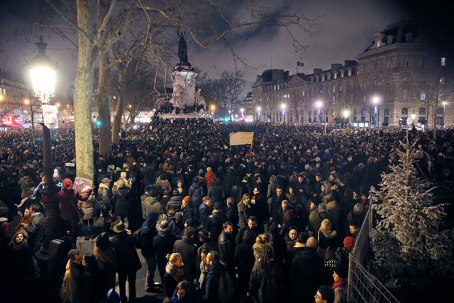 Уже через час площадь заполнилась до отказа. Чувствовалось оживление и даже некоторый ажиотаж — несмотря на драматичность момента, в толпе не было ненависти или злобы, наоборот — люди робко улыбались друг другу. Неожиданно тихий гул толпы перерос в скандирование «Шарли! Шарли!», а затем и «Liberté!» («Свобода!») В тот же момент над морем людей появилась составленная из электрических лампочек надпись NOT AFRAID («Мы не боимся»), и площадь взорвалась аплодисментами. В этот момент никакой информации о террористах не было, но кажется, что эта многотысячная толпа действительно их совершенно не боялась. Только через четыре часа в прессе назвали имена трех подозреваемых — братьев Саида и Шерифа Куаши (34 и 32 года) и Хамида Мураде (18 лет). А пока на статуе Республики отображалась проекция надписи «Мы все — Шарли». Толпа в унисон повторяла ее.