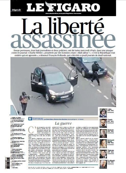Le Figaro: «Это война, настоящая война, которую ведут не солдаты, а убийцы, прячущиеся в тени, методичные и организованные преступники, от их обдуманного и подготовленного варварства леденеет кровь… Эта война идет уже давно, хотя мы не хотели ее замечать. Она ведь проходила так далеко от нас, правда? На границах Сирии, Ирака, Нигерии или Ливии. Мы стеснялись, а вероятно, еще и боялись называть ее по имени… С этого момента эвфемизмы больше не уместны — нам объявили настоящую войну: это война исламистского фанатизма против Запада, Европы и демократических ценностей».