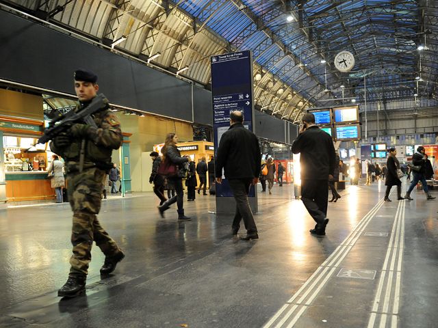 Фото: Antoine Antoniol / Getty Images Военный патрулирует Восточный вокзал, Париж, 8 января 2015 года