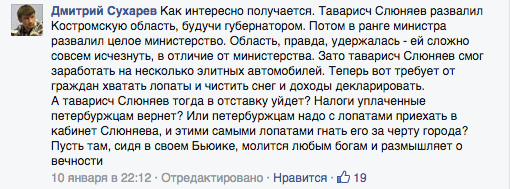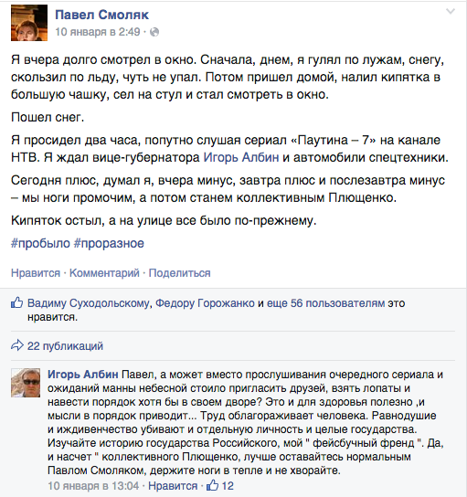 Один комментарий в Facebook вице-губернатора Петербурга Игоря Албина стал поводом для городского медиаскандала. Петербуржцы в очередной раз пожаловались на неубранный снег, а Албин посоветовал им взять лопаты и самим навести порядок во дворе. «Бумага» проследила, как предложение чиновника переросло в напряженную дискуссию, что об уборке снега думают депутаты, журналисты, правозащитники и как Албин цитировал Салтыкова-Щедрина и изгонял бесов со своей страницы. В конце прошлой недели в Петербурге прошли снегопады, на дорогах образовалась «каша» из снега и соли, а горожане, как и каждой зимой в Петербурге, отметили, что улицы плохо чистят. Редактор журнала «Шум» Павел Смоляк опубликовал пост, в котором пожаловался на не убранный во дворе снег, не приехавшую спецтехнику и упомянул нового вице-губернатора Игоря Албина. В ответ чиновник написал, что «вместо прослушивания очередного сериала и ожиданий манны небесной стоило пригласить друзей, взять лопаты и навести порядок хотя бы в своем дворе». «Труд облагораживает человека. Равнодушие и иждивенчество убивают и отдельную личность и целые государства», — констатировал Албин.