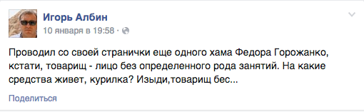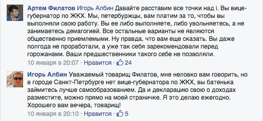 Некоторые пользователи, вступившие в спор, правда, заметили, что даже если вице-губернатор отвечает «не всегда правильно», то хотя бы отвечает, чем не занимается большинство его коллег. Прокомментировал запись и создатель сайта zalivaet.spb Федор Горожанко, написавший, что «Игорь Николаевич реально ******* [ненормальный]» . После этого Албин удалил его из друзей со словами «Изыди, товарищ бес».