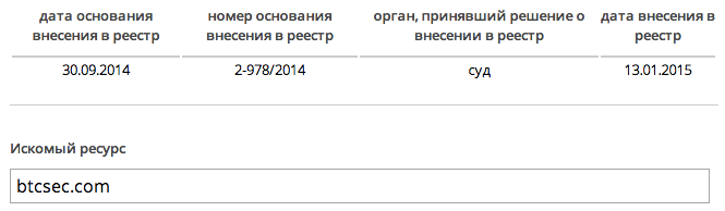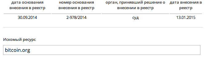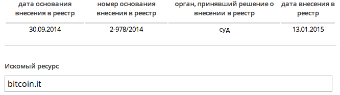 Роскомнадзор внес в реестр запрещенных сайтов пять ресурсов о биткоинах — bitcoin.org (сайт поддерживается благотворительным фондом Bitcoin Foundation); btcsec.com, bitcoin.it, coinspot.ru (российские сообщества); и обменник indacoin.com. Все пять сайтов заблокированы в соответствии с решением суда от 30 сентября 2014 года. В реестр их внесли только 13 января.