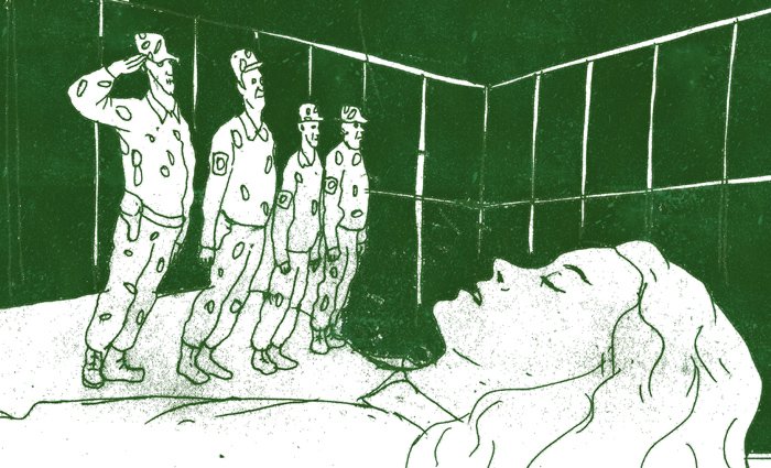 Они в квартире с его мамой, это древняя старушка, ещё до войны родилась. Разумеется, она ничего не слышит и не помнит, хотя в протоколе допроса написано, будто она слышала в соседней комнате звук падающего тела. Эти показания в суде старушка отрицала, пояснив, что следователь — это «очень странное явление». Ещё она говорила, что видела тело женщины, но не знала, живая она или нет. Судья переспросила, трогала ли она тело. «Нет, вы что, — ответила старушка, — я мертвых не трогаю».