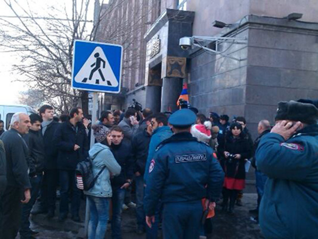 Стражи правопорядка препятствовали приближению демонстрантов к воротам здания. Несколько молодых людей попытались сжечь государственный флаг Российской Федерации, однако им помешали другие участники акции. Полицейские бросились отбирать флаг, в результате чего началась потасовка. Спустя некоторое время страсти улеглись, а демонстранты запели гимн Армении. Стражи правопорядка снова принялись расталкивать собравшихся, в том числе журналистов. На место прибыли отряды специального назначения.