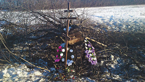 Деревянный крест, установленный бойцами украинского отряда на месте трагедии, Донецкая область, 14 января 2015 года