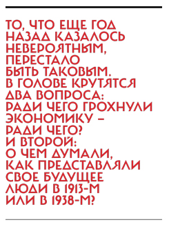 Стремительность обвала завораживает: еще весной казалось — ну да, стагнация, ну да, ВВП в ближайшие годы будет балансировать вокруг нуля, еще осенью, в октябре-ноябре, вполне здравые экономисты убеждали, что рубль недооценен и к концу года курс будет в районе 35 руб. за $1. «Черный вторник» 16 декабря стал шоком: банкиры перестали давать какие-либо прогнозы. Правительство де-факто перестало существовать (о том — на стр. 44), хотя премьер и его министры по-прежнему ездят на работу на Краснопресненскую набережную. Президент продолжает верить в то, что он по-прежнему держит бога за бороду, что утерянный фарт, сопутствующий ему все его пятнадцать лет у власти, вернется, саудиты не устоят, нефтяной краник перекроют, американский сланец обанкротится, баррель вновь зареет над Кремлем в обнимку с двуглавым российским орлом, санкции — слабая и падкая до больших денег европейская элита отменит, кошмар закончится и будет им с Сечиным счастье. Сказать себе, что принятые им — им, лично Путиным, — решения об аннексии Крыма и развязывании гражданской войны на востоке Украины — это была катастрофическая ошибка, — он не может. Потому что следующий за этим шаг, если думать об интересах страны, — «я ухожу, берегите Россию», как сказал когда-то Ельцин, передавая ему власть. В демократических странах правительства в таких ситуациях уходят в отставку, объявляются досрочные выборы — у нас же люди в масках обыскивают офис «Фонда борьбы с коррупцией», занимающегося теми, кто давно должен сменить свои кабинеты на что-то менее комфортное. Впереди — опустошение резервов, что может случиться, если не к концу года (а может и к концу года, если катастрофические ошибки будут множиться, считает экономист Сергей Гуриев — интервью с ним на стр. 23), то к середине 2016 года, обнищание не только российской провинции — там процессы уже пошли (стр. 28), но и больших городов. Что — дальше? Война всех со всеми? Российские танки в Европе? Ядерная война? Апокалиптические сценарии, столь популярные в восьмидесятых годах прошлого века, вдруг снова вошли в дискурс. То, что еще год назад казалось невероятным, перестало быть таковым. И в голове крутятся два вопроса: ради чего грохнули экономику — ради чего? И второй: о чем думали, как представляли свое будущее люди в 1913-м или в 1938-м?