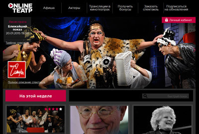 На портале onlineteatr.com можно смотреть спектакли московских театров в режиме прямых трансляций в HD-качестве. К проекту уже подключились Театр им. В. Маяковского, Театр им. Е. Вахтангова, Театр Сатиры, а также актеры Владимир Симонов, Владимир Этуш, Алексей Гуськов, Анна Ардова, Игорь Костолевский, Андрей Барило и Сергей Маковецкий.