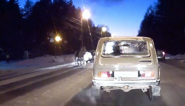 В Челябинске запечатлели аварию с участием лошади: два животных перебегали дорогу на красный сигнал светофора. Одной лошади удалось проскочить между автомобилями, а вторая врезалась в машину. Через несколько секунд после происшествия она поднялась с земли и побрела в обратную сторону.