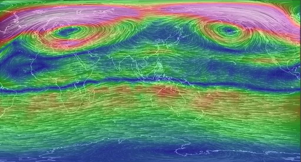 Области розового цвета, напоминающие брови Джаббы Хата, обозначают ветра с высокой скоростью. Линия, которая выглядит как рот, проходит по экваториальному поясу, где дуют пассаты, вызывающие сильные ливни. Синий цвет означает низкую скорость ветров.