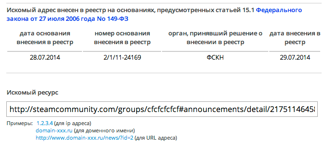 «Медуза» обнаружила в реестре запрещенных сайтов как минимум одну страницу с сайта steamcommunity.com (там расположено сообщество игроков). На этой странице размещен текст о марихуане, датированный 10 июня 2011 года. Решение ФСКН было вынесено 28 июля 2014 года.