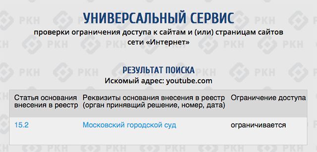 Блокировка доступа к видеохостингу YouTube объясняется на сайте Роскомнадзора борьбой с пиратством. При проверке адреса YouTube через специальный сервис на сайте Роскомнадзора, появляется сообщение, что доступ «ограничен» по требованию Мосгорсуда на основании статьи 15.2 («борьба с пиратством»).