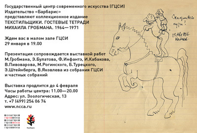 © ГЦСИ Сегодня, 29 января, в Малом зале Государственного центра современного искусства в Москве по случаю презентации книги «Текстильщики. Гостевые тетради Михаила Гробмана 1964–1971» открывается четырехдневная выставка художников, о которых идет речь в книге.