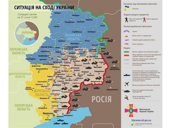 Карта АТО по версии Министерства обороны Украины Поздно вечером в пятницу по московскому времени Организация Объединенных Наций призвала украинские власти и сепаратистов заключить временное перемирие для эвакуации жителей Горловки и Дебальцево, а также доставки туда гуманитарной помощи.