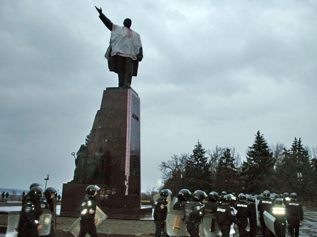 Как сообщает "Сегодня.ua", вечером в субботу, 31 января, сотни запорожцев собрались на площади возле памятника Ленину, чтобы его снести. Одним из организаторов акции стала новая запорожская общественная организация "Сила нации", пригласившая всех на акцию.