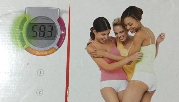На коробке от электронных весов Tefal обнаружили фотографию с двумя с половиной женщинами: несмотря на то, что в верхней части снимка изображены три головы и туловища, на самих весах стоит только две пары ног.