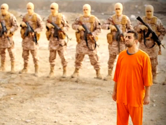 На кадрах видно молодого человека в оранжевой робе - старшего лейтенанта иорданских ВВС Муаза Юсефа аль-Касасба, F-16 которого разбился 24 декабря над Раккой. Его ведут к железной клетке, которую затем охватывает огонь. После этого клетку с останками заваливают камнями и землей.