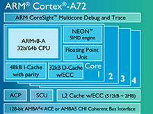 Согласно информации, опубликованной на сайте ARM, по вычислительной мощности ядро Cortex-A72 превосходит ныне используемые Cortex-A15 и Cortex-A57 в 3,5 раза и в 2 раза соответственно. Оно поддерживает 64-битные команды, его максимальная тактовая частота составляет 2,5 ГГц, а при определенных условиях она может быть увеличена до 3 ГГц.