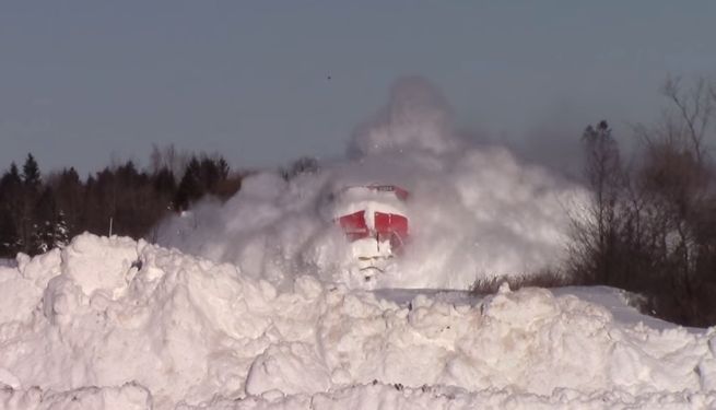 Житель канадской провинции Нью-Брансуик Даррен Гордон (Darren Gordon) заснял, как поезд проезжает через многодневный слой снега. Локомотив мчится на всех парах, создавая перед собой гигантские ледяные облака.