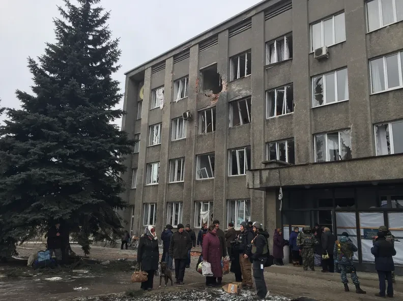 Автобус украинских эмчээсовцев проскакивает к центру Дебальцева в тишине. Примерно 10 утра на часах. Тишина длится с рассвета, и совсем скоро должно начаться. Автобус подъезжает к главному эвакуационному пункту у горсовета, где уже собрались полторы сотни человек. И стоим небольшой группой мы, журналисты. Уже громыхнуло в окрестностях. Люди начинают быстро пробиваться внутрь салона.
