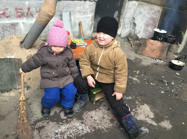 От девятиэтажек на Емченко, 1, — они выстроены буквой «П» — до эвакопункта у горсовета нужно пройти около 300 метров. Но для многих это расстояние оказывается непреодолимым. Безо всяких условий люди обитают в трех подвалах — по каждому на корпус. И, оказываясь на поверхности, не отходят дальше 10 метров от входов. Здесь нет никакой связи, и из слухов рождаются самые кошмарные новости. Люди не могут знать, что происходит в мире, в Артемовске, «на горсовете» и в соседнем подвале. Здесь остались самые «тяжелые» — инвалиды, старики, бродяги и несколько детей. Люди собирают для питья сточную воду. Рядом со входом в подвал разведен костер. Тучная женщина с опухшим лицом мешает на костре похлебку коричневого цвета. Всего у подвала человек семь.