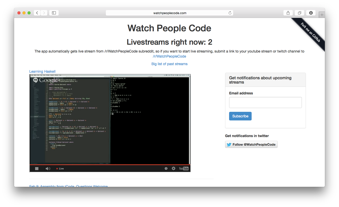 Сайт берет ссылки трансляции с одноименного раздела на Reddit — а уже там их публикуют сами программисты. Кроме текущих трансляций, на Watch People Code можно увидеть, что появится в ближайшее время и просмотреть записи уже прошедших трансляций.