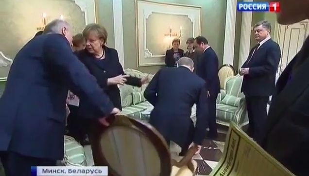 Перед началом минских переговоров об урегулировании конфликта в Донбассе камеры запечатлели непродолжительную борьбу Александра Лукашенко и Владимира Путина за стул. Российский президент пытался придвинуть себе стул, за спинку которого держался президент Белоруссии.