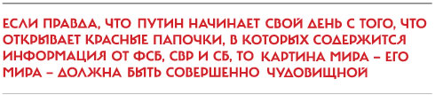 Ключевая проблема состоит в том, что если правда, что Путин начинает свой день с того, что открывает красные папочки, в которых содержится информация от ФСБ, СВР и СБ, то картина мира — его мира — должна быть совершенно чудовищной. Если смотреть на события через оптику Патрушева и его аналитического аппарата, невольно начнешь искать под фонарем агента ЦРУ, выведывающего стратегические секреты РПЦ (бога нет — в этом что ли секрет?), и лишать допуска к гостайне сотрудников, чьи дети учатся заграницей.