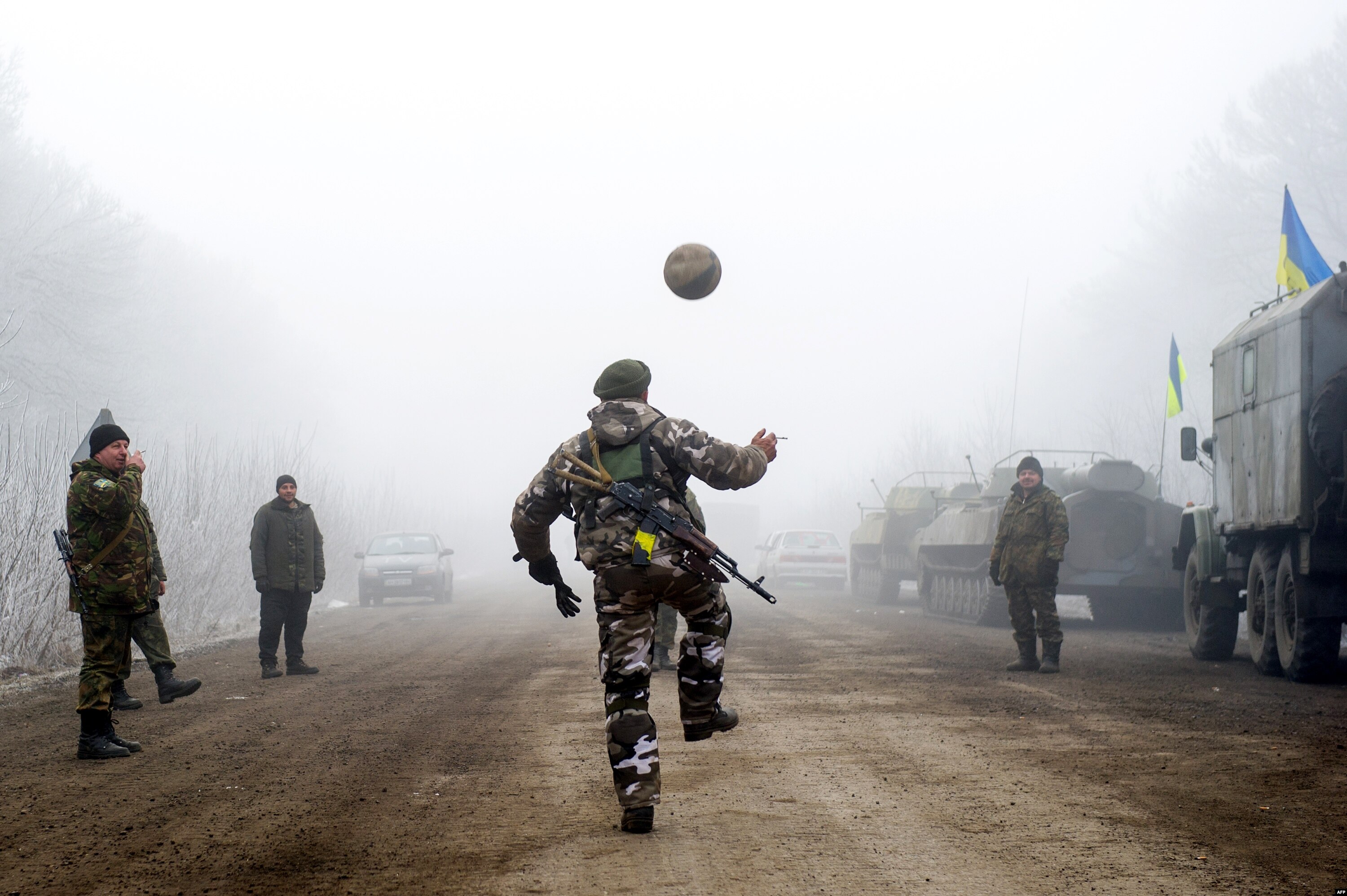 – История этой фотографии примерно следующая. Когда было оглашено перемирие, мы, представители прессы, на следующее утро поехали оценить, насколько оно соблюдается на практике, что происходит в непосредственной близости от зоны боестолкновений. Мы поехали по трассе в сторону Дебальцева, и где-то в середине, наверное, километрах в 20 от Дебальцева, встретили небольшую колонну украинской бронетехники и некоторое количество украинских военнослужащих. Они, можно сказать, отдыхали, потому что первая ночь после перемирия характеризовалась значительно меньшей интенсивностью обстрелов, чем предыдущие. Ребята были значительно более расслаблены, они поели, ожидали новых приказов руководства и решили поиграть в мяч, который нашли там же, в овраге. Так сложилось, что их общее расслабленное состояние, этот мяч, который им попался, стали символом перемирия.