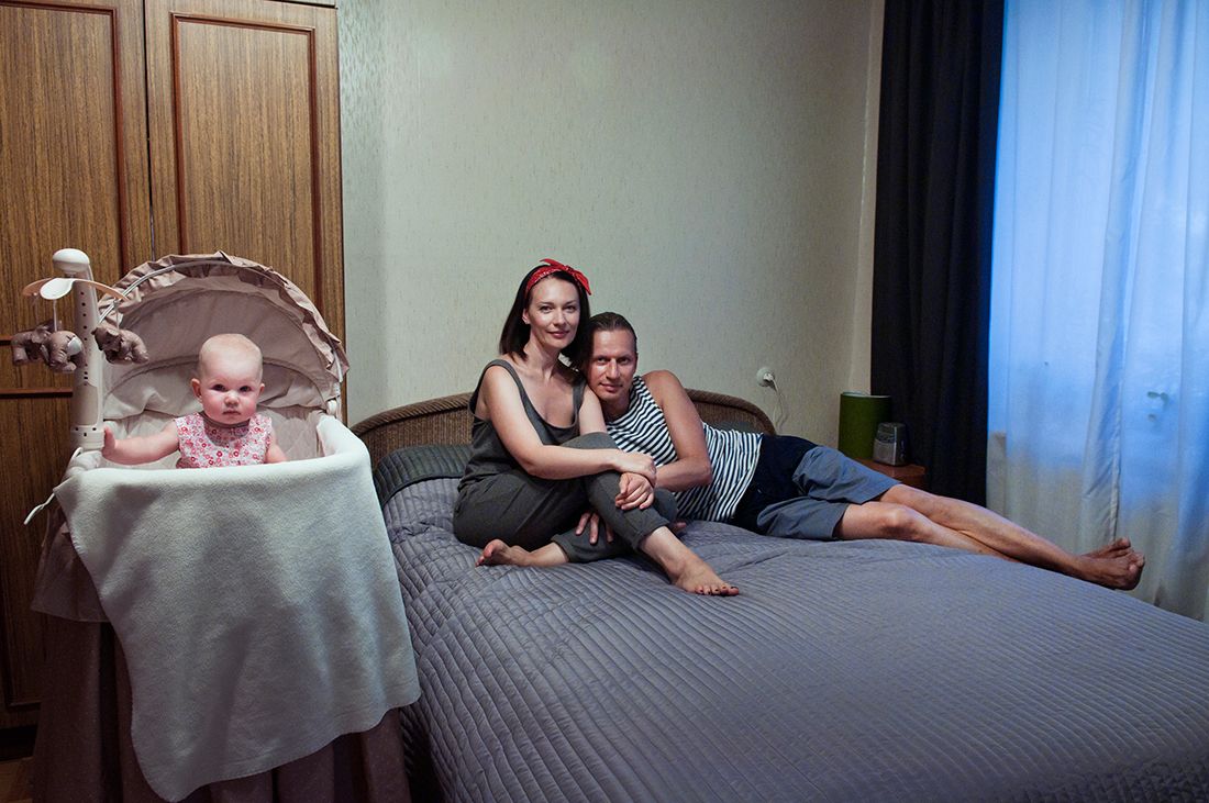 Vladimir is a Russian contemporary artist. Olga, born in Ukraine’s Kirovogradskaya region, is a ballerina. They live together in Khimki, just outside Moscow, with their newborn baby.