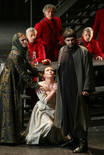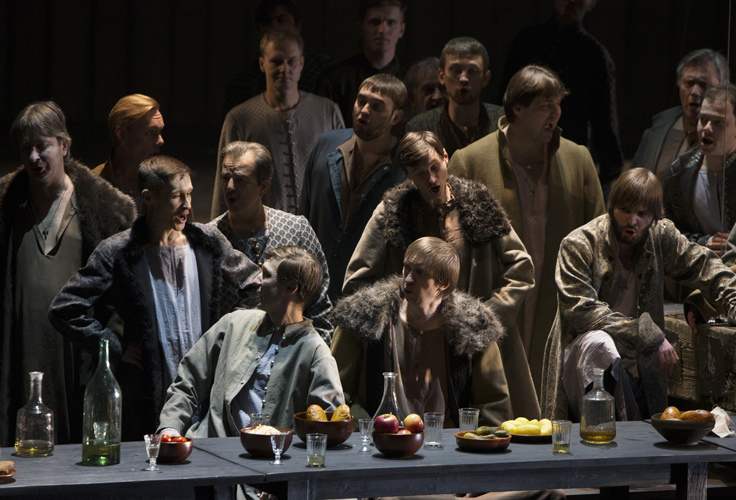 Это и вправду оказался сильный козырь. Оркестр прямо какой-то по-хорошему взбудораженный. Есть в нем и размах, и вкусные подробности, и сочность, и динамизм. Голосистый премьерный состав крепко сколочен, все солисты свои: Марфа — Ксения Дудникова, Досифей — Денис Макаров, князь Голицын — Нажмиддин Мавлянов, Андрей Хованский — Николай Ерохин, Шакловитый — Антон Зараев. Над всеми царит Ульянов в партии Ивана Хованского, своей свободой и мощью превращая его в героя, которому хочешь не хочешь, а приходится сочувствовать.