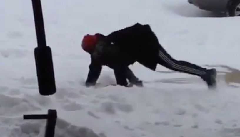 Человека, в процессе чистки снега падавшего девять секунд подряд, засняли на видео. В итоге он выпустил лопату из рук, но все-таки устоял на ногах.
