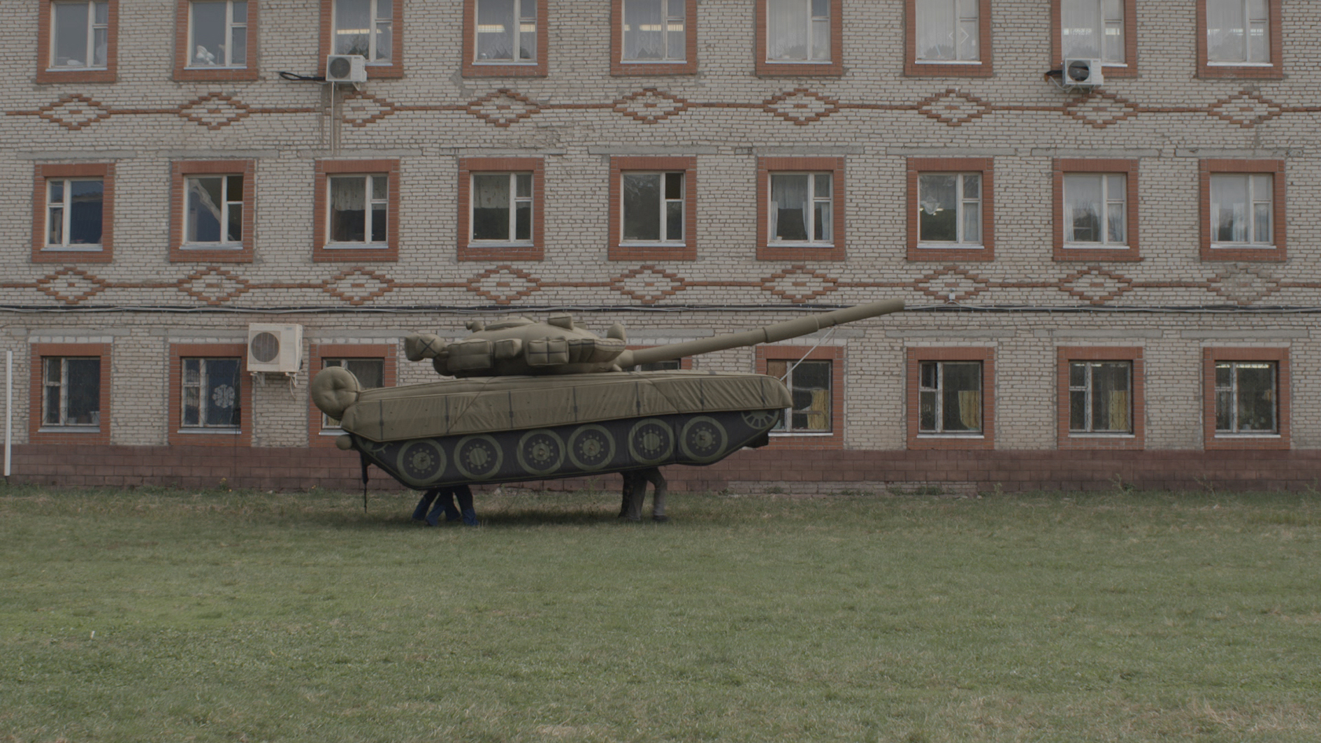 – Мой бойфренд, он был звукооператором фильма, читал книгу об акустическом оружии, и там говорилось о подразделении американской армии, которая использовала надувную артиллерию, чтобы отвлечь неприятеля от мест, где были дислоцированы настоящие войска. Мне это показалось замечательным, я стала искать нечто подобное и быстро обнаружила, что такая фабрика существует в России, и российская армия использует подобное вооружение по сей день. Поскольку предприятие не является государственным, было несложно получить разрешение на съемки, к тому же они делают еще и воздушные шары и детские надувные замки для прыжков, так что это тоже сюрреалистично – смотреть, как они надувают танк, а потом что-то мастерят для детей. Все это выглядит вроде бы невинным, но, разумеется, это не так.