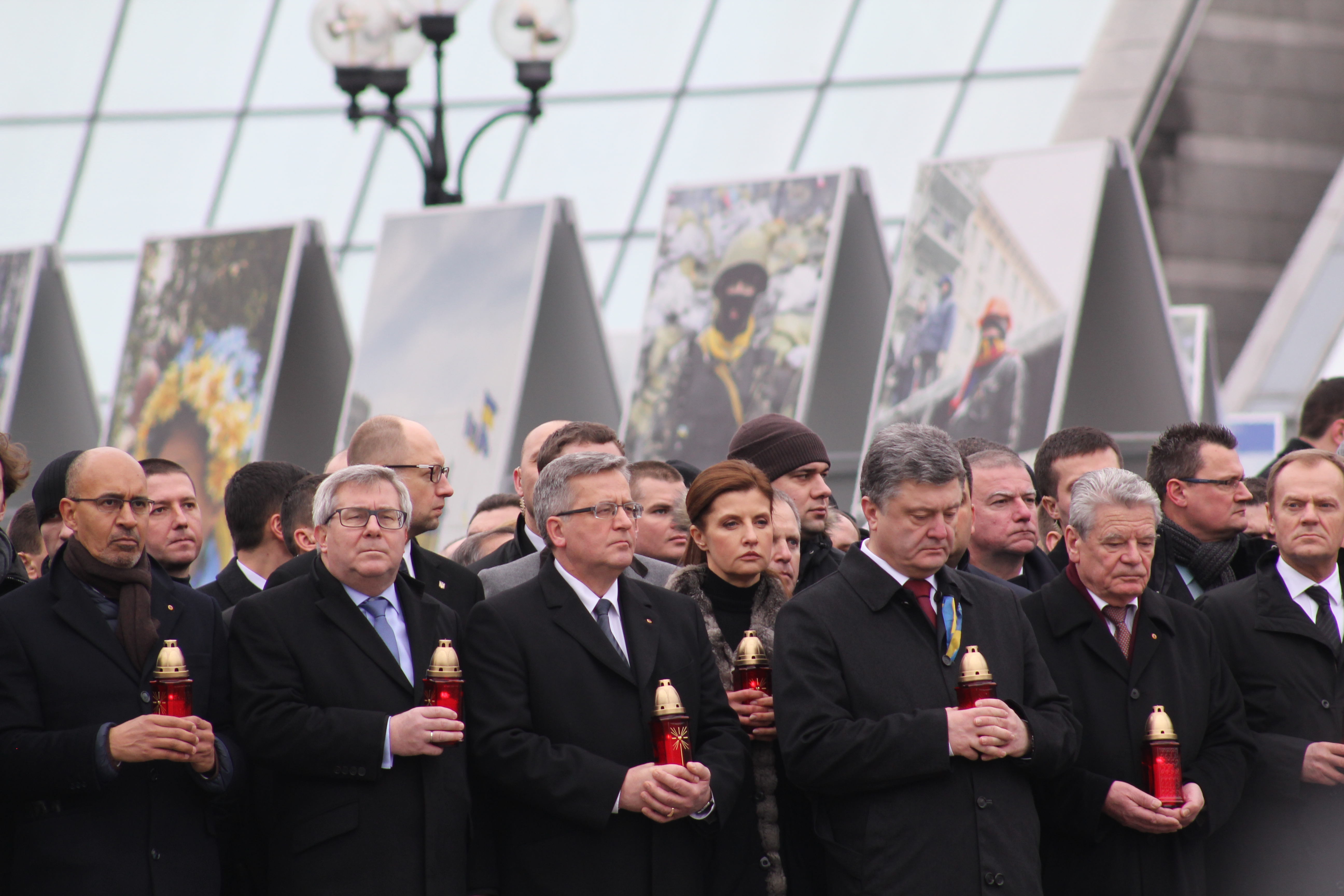 "Марши достоинства" в память о погибших на Майдане год назад активистах прошли сегодня в нескольких городах Украины. Несмотря на взрыв в Харькове, маршрут киевского марша было решено оставить без изменений. В первом ряду "Марша достоинства" шли президенты: Украины – Петр Порошенко, Литвы – Даля Грибаускайте, Польши – Бронислав Коморовский, Федеративной Республики Германия – Йоахим Гаук, Молдавии – Николае Тимофти, Грузии – Георгий Маргелашвили, Словацкой Республики – Андрей Киска, президент Европейского совета Дональд Туск. Таким образом европейские лидеры продемонстрировали не только свою солидарность с украинским народом, но и готовность к совместным действиям с Украиной, противостоящей российской агрессии. Во время шествия его участники скандировали: "Украина – это Европа", "Слава Украине – героям слава", "Слава нации – смерть врагам”. Шествие завершилось под звуки гимна Евросоюза на главной столичной площади, где состоялся молебен за мир.