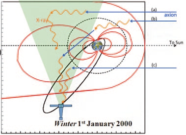 Интересная статья появилась в 2014 году. Джордж Фрейзер (George Fraser) и его соавторы заявили, что обнаружили косвенные данные в пользу существования аксионов, используя космический рентгеновский телескоп XMM-Newton. Если от Солнца летят аксионы, то они могут взаимодействовать с магнитным полем Земли и превращаться в фотоны за счет эффекта Примакова. Солнечные аксионы должны давать фотоны рентгеновского диапазона. Важно: чтобы их увидеть, прибор не должен быть прямо направлен на солнце. Ведь в магнитосфере успевает произойти несколько превращений (см. рис.). Поскольку взаимная ориентация силовых линий геомагнитного поля, направления наблюдений и Солнца меняется в течение года, то спутник должен видеть, что фоновое излучение также немного меняется в течение года. Фон, связанный с далекими галактиками, с межзвездным газом и тому подобным, остается примерно постоянным, а вот аксионная часть должна варьироваться. И такой эффект обнаружен. Правда, пока совсем не очевидно, что эффект надо объяснять именно аксионами.