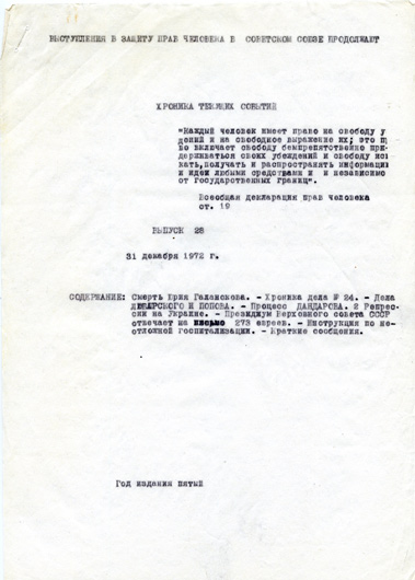 А в третьем, если не ошибаюсь, выпуске «Памяти» был текст от редакции — поздравление «Хронике текущих событий» с 10-летием существования, это был 1978 год. Там, в этом тексте, в неявном, правда, виде была высказана мысль о взаимодополнительности наших двух изданий: мол, поскольку Сопротивление 1968—1978 гг. тоже становится историей, то «Хроника» — это еще и будущий исторический источник. В некотором смысле «Хроника» — это будущее «Памяти». А Арсений еще проще говорил, безо всякой метафорики: «Хроника» занимается документированием того, что было после 1968-го, а «Память» — документированием того, что было до «Хроники».