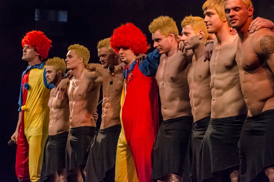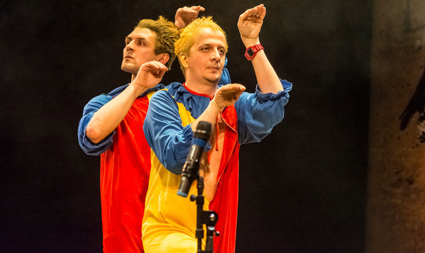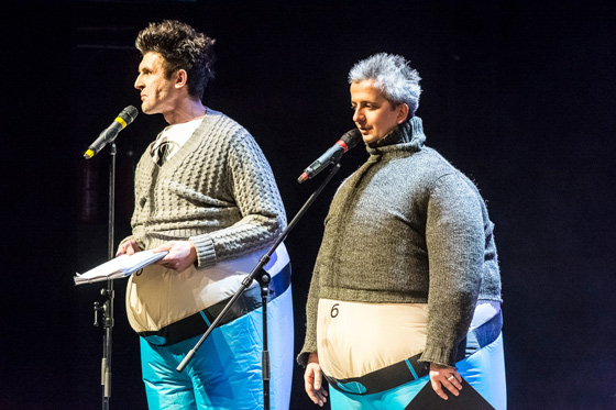 © Галина Фесенко В полтора часа «Гвоздя сезона» уместилось увесистое черт-те что: Богомолов и Епишев являлись к публике, потрясая накладными животами, и пускались в апарты, беседуя с сидящими в зале режиссерами Волкостреловым и Житинкиным. Пели истинно русскую песню Вики Цыгановой (вместе со стриптизерами из клуба «Эгоистка» в нарядных кожаных трусах патриотического кроя) и «аидскую» (ну то есть про оперу «Аида»). Занимались контрпропагандой гомосексуализма, разоблачали театрального Левиафана, приветствовали ведущего артиста труппы Альфа-Центаврского драматического театра имени Чубакки и высекали сок из березового планшета сцены центра «На Страстном» (эта мизансцена была представлена как фрагмент из нового спектакля московского губернского театра «Русское дышло»). И совершенно напрасно артист Олег Соколов репликами пушкинского героя призывал Председателя (понятно какого — председателя СТД) остановить пир во время чумы: «наперсники Калягулы» раздухарились как в последний раз.