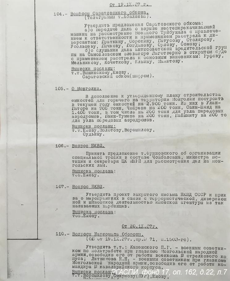 Проект этого приказ, днем ранее, был рассмотрен и утвержден на заседании (вопрос №107) Политбюро ЦК ВКП(б). Одновременно с ним был утвержден и проект закрытого письма НКВД СССР «О мероприятиях в связи с террористической, диверсионной и шпионской деятельностью японской агентуры из так называемых харбинцев», получивший №60268.
