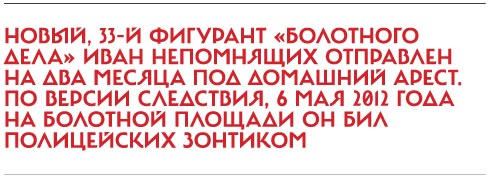Новый фигурант «Болотного дела» Иван Непомнящих отправлен на два месяца под домашний арест. Басманный суд запретил ему общаться с кем-либо, кроме близких, а также пользоваться средствами связи и давать комментарии по делу. Непомнящих задержали 25 февраля, по версии следствия, 6 мая 2012 года на Болотной площади активист бил полицейских зонтиком. Непомнящих своей вины не признает, он стал 33-м фигурантом «Болотного дела».