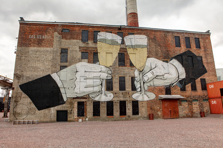 Завод находится в дальнем индустриальном районе Петербурга, который исторически называется Ржевка-Пороховые. Построили его сразу после войны, в 1945 году, для изготовления фарфоровых изоляторов для электросетей. Затем пришло время хрущевского соревнования с Америкой, стране потребовались новые, современные материалы, и завод перепрофилировали для выпуска ДБСП — декоративных бумажно-слоистых пластиков, которые использовались в отделке интерьеров: лифтов, эскалаторов метро, поездов, кухонных гарнитуров (можно считать это неким художественным прошлым, приближающим настоящее). В лихие 90-е производство тихо умерло, и новым (и, что важно в данном случае, достаточно молодым) владельцам и инвесторам не раз предлагали выстроить на его месте жилой квартал или торгово-развлекательный комплекс. Пустующие цеха использовали по-разному, в том числе (как это было модно в 90-е) проводили музыкальные рейвы и артистические party. И вот (согласно легенде) после одной из таких party, посвященной граффити, пришла идея инвестировать энергию и мастерство уличных художников в недвижимость. Производство восстановили, завод заработал, а художников стали приглашать делать росписи прямо на закрытой территории как внутри цехов, так и снаружи, благо пустых стен было достаточно. Какое-то время эта история так и развивалась весьма закрыто. Чтобы попасть на завод, надо было предварительно договориться, выписать пропуск, обзавестись сопровождающим и только тогда получить возможность прикоснуться к искусству. Но художники отзывались на предложение и приезжали. За несколько лет на территории появилось 12 росписей интересных российских стрит-артистов (Паша 183, Кирилл Кто, Никита Nomerz, Тимофей Радя) и даже звездного испанца Escif.