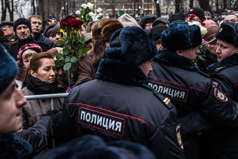 С 10 часов утра не иссякала толпа желающих проститься с погибшим политиком. Под непрекращающиеся щелчки фотокамер люди возлагали цветы рядом с гробом. Зал Сахаровского центра был завешан черно-белыми фотографиями Немцова. В левом углу напротив входа проектор в режиме слайд-шоу демонстрировал снимки оппозиционера: в правительственных кабинетах, на митингах, среди родных и друзей.