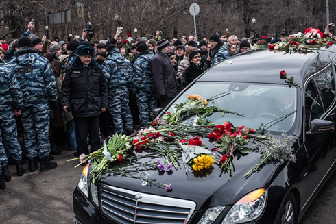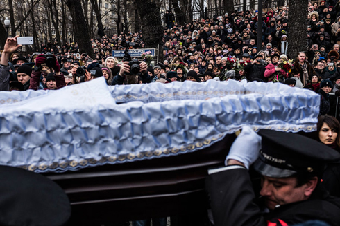 Примерно в 13:45 вход в центр Сахарова закрыли. Люди передавали цветы из рук в руки, чтобы их возложили у гроба. К зданию подъехал катафалк, в него погрузили гроб с телом политика. Под аплодисменты и скандирование оппозиционных лозунгов катафалк уехал на Троекуровское кладбище.