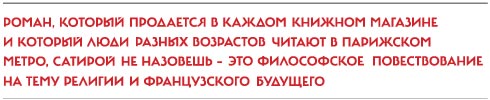 * * Michel Houellebecq, Soumission, Paris, Flammarion, 2015. — можно перевести на русский и как «Подчинение», и как «Покорность». Перед тем, как она появилась, все во Франции думали, что это будет очередной уэльбековский скандал, политическая антиутопия и сатира. Но, побывав неделю назад в Париже, я могу твердо сказать: роман, который продается в каждом книжном магазине и который люди разных возрастов читают в парижском метро, сатирой не назовешь — это вполне философское повествование на тему религии и французского будущего.