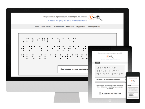 На этапе постановки мы сразу обозначили приоритетом номер один обеспечение доступности сайта для людей с ограниченными возможностями зрения. Мы хотели, чтобы они могли пользоваться им самостоятельно, без помощи, несмотря на то, что сами представители МРООИ «СВЕТ» не были уверены в том, что это возможно.